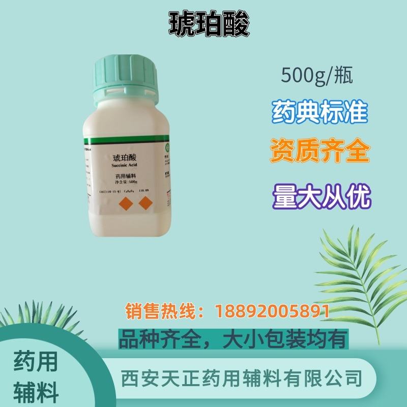 C4H6O4 118.09 [110-15-6] 本品为丁二酸,含C4H6O4应为99.0%~100.5%。 【性状】本品为白色结晶。 本品在甲醇中易溶,在乙醇或水中溶解,在丙酮中略溶。 熔点 本品的熔点(通则0612第一法)为185~190℃。 【鉴别】本品的红外光吸收图谱应与对照品的图谱一致(通则0402)。 【检查】炽灼残渣 取本品,依法检查(通则0841),遗留残渣不得过0.025%。 重金属 取本品1.0g,加水20ml溶解,用6mol/L氨溶液调节pH值至3.0~4.0,加水稀释至25ml,依法检查(通则0821第一法),含重金属不得过百万分之二十。 【含量测定】取本品约0.25g,精密称定,加新沸放冷的水25ml溶解后,加酚酞指示液2~3滴,用氢氧化钠滴定液(0.1mol/L)滴定至溶液显粉红色,即得。每1ml氢氧化钠滴定液(0.1mol/L)相当于5.905mg的C4H6O4。 【类别】药用辅料,缓冲剂和pH值调节剂。 【贮藏】密闭保存。