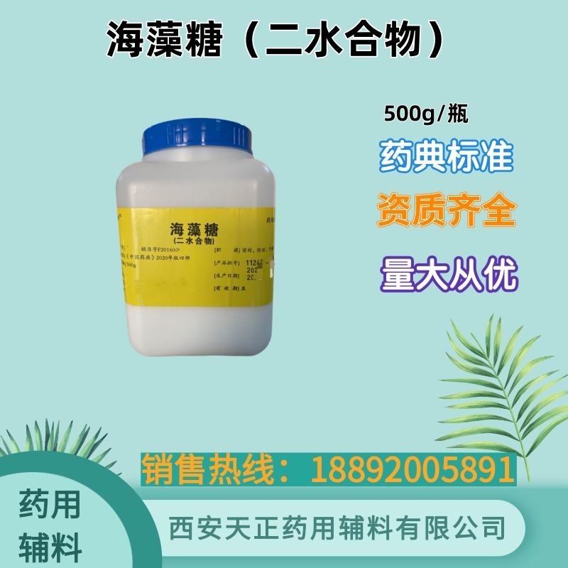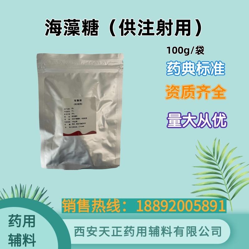 C12H22O11 342.30 [99-20-7] C12H22O11·2H2O 378.33 [6138-23-4] 本品由食用级淀粉酶解而成。为两个吡喃环葡萄糖分子以1,1-糖苷键连接而成的非还原性双糖,可分为无水物和二水合物。按无水物计算,含C12H22O11应为98.0%~102.0%。 【性状】本品为白色或类白色结晶性粉末。 无水海藻糖在水中易溶,在甲醇或乙醇中几乎不溶。二水海藻糖在水中易溶,在甲醇中微溶,在乙醇中几乎不溶。 比旋度 取本品,精密称定,加水溶解并定量稀释制成每 l ml 中约含 100 mg的溶液,依法测定(通则0621),比旋度为+197°至+201°。 【鉴别】(1)取本品 2 g,加水 5 ml 使溶解,取 l ml,加α-萘酚乙醇溶液(1→20)0.4 ml,沿容器壁缓慢加入硫酸0.5ml,溶液即在两液界面处产生紫色环。 (2) 取本品0.2g,加水5ml溶解,作为供试品溶液;取甘氨酸0.2g,加水5ml溶解,作为甘氨酸溶液。量取供试品溶液2ml,加入稀盐酸1ml,室温静置20分钟;再加入氢氧化钠试液4ml和甘氨酸溶液2ml,于水浴中加热10分钟后,溶液不显棕色。 (3) 在含量测定项下记录的色谱图中,供试品溶液主峰的保留时间应与对照品溶液的主峰保留时间一致。 (4) 本品的红外光吸收图谱应与对照品的图谱一致(通则0402)。 【检查】酸度 取本品1.0g(按无水物计算),加水10ml使溶解,依法测定(通则0631),pH值应为4.5~6.5。 溶液的澄清度与颜色 取本品33.0g(按无水物计算),置100ml量瓶中,加新沸放冷的水充分振摇使溶解,照紫外-可见分光光度法(通则0401),在420nm与720nm波长处测定吸光度。在720nm波长处的吸光度值不得过0.033,420nm与720nm波长处的吸光度差值不得过0.067。 氯化物 取本品0.40g,依法检查(通则0801),与标准氯化钠溶液5.0ml制成的对照液比较,不得更浓(0.0125%)。 硫酸盐 取本品1.0g,依法检查(通则0802),与标准硫酸钾溶液2.0ml制成的对照液比较,不得更浓(0.020%)。 可溶性淀粉 取本品l.0g,加水10ml溶解后,加碘试液1滴,不得显蓝色。 有关物质 取本品适量,精密称定,加水溶解并定量稀释制成每1ml中约含10mg的溶液,作为供试品溶液;精密量取1ml,置100ml量瓶中,用水稀释至刻度,摇匀,作为对照溶液。照含量测定项下的色谱条件,取对照溶液10μl注入液相色谱仪,记录色谱图,主成分峰高的信噪比应大于10;再精密量取供试品溶液和对照溶液各10μl,分别注入液相色谱仪,记录色谱图。供试品溶液色谱图中,除溶剂峰外,供试品溶液主峰之前、之后的杂质峰面积之和分别不得大于对照溶液主峰面积的0.5倍(0.5%)。 水分 取本品,照水分测定法(通则0832)测定,含水分应为9.0%~11.0%;如为无水物,含水分不得过1.0%。 炽灼残渣 取本品,依法检查(通则0841),遗留残渣不得过0.1%。 重金属 取本品4.0g,加水23ml溶解后,加醋酸盐缓冲液(pH3.5)2ml,依法检查(通则0821第一法),含重金属不得过百万分之五。 微生物限度 取本品,依法检查(通则1105与通则1106),每1g供试品中需氧菌总数不得过103cfu,霉菌和酵母菌总数不得过102cfu,不得检出大肠埃希菌;每10g供试品中不得检出沙门菌。 细菌内毒素(供注射用) 取本品,依法检查(通则1143),每1mg海藻糖中含内毒素的量应小于0.05EU。 【含量测定】照高效液相色谱法(通则0512)测定。 色谱条件与系统适用性试验 釆用磺化交联的苯乙烯-二乙烯基苯共聚物为填充剂的强阳离子钠型(或氢型)色谱柱;以水为流动相;流速为每分钟0.4ml;柱温为80℃;示差折光检测器。取麦芽三糖、葡萄糖与海藻糖对照品适量,加水溶解并稀释制成每1ml中各含2.5mg、2.5mg、10mg的溶液,精密量取20μl注入液相色谱仪,重复进样3次,记录色谱图,主峰面积的相对标准偏差不得过2.0%,各色谱峰的分离度应符合要求。 测定法 取本品适量,精密称定,加水溶解并定量稀释制成每1ml中约含10mg的溶液,作为供试品溶液,精密量取20μl注入液相色谱仪,记录色谱图;另取海藻糖对照品适量,同法测定。按外标法以峰面积计算,即得。 【类别】药用辅料,矫味剂、甜味剂、冷冻干燥辅料、稀释剂、增稠剂和保湿剂等。 【贮藏】密封,阴凉、干燥处保存。
