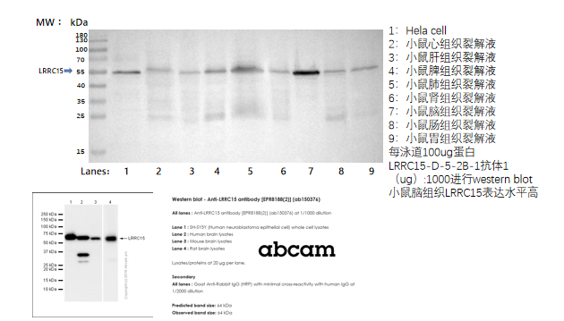 产品编号: nrbe-12385A产品类型: 小鼠单克隆抗体英文名称: Leucine-rich repeat-containing protein 15中文名称: 富含亮氨酸重复序列蛋白 15产品应用: ELISA=1:500-5000,WB=1:1000-5000,IF=1:100-500Optimal working dilutions must be determined by the end user.Not yet tested in other applications.交叉反应: Human,Mouse抗体来源: Mouse免疫原: Recombinant Human LRRC15 protein性状: Liquid纯化方法: affinity purified by Protein A浓度: 1mg/ml储存液: 0.01M PBS (pH7.4) with 1% BSA, 0.02% Proclin300 and 50% Glycerol.保存条件: Shipped at 4℃. Store at -20℃ for one year. Avoid repeated freeze-thaw cycles.注意事项: This product as supplied is intended for research use only, not for use in human, therapeutic or diagnostic applications.背景资料: LRRC15 作为肿瘤微环境与纤维化进程的关键调控因子,其表达上调与成纤维细胞活化、细胞外基质重塑密切相关,是解析基质 - 肿瘤细胞交互作用的重要靶点。LRRC15 属于富含亮氨酸重复序列(LRR)超家族,为 I 型跨膜蛋白,胞外段含 15 个串联 LRR 结构域及 C 端 LRRCT 结构域,跨膜区连接短胞内段。LRR 结构域通过介导与细胞因子、细胞外基质蛋白的相互作用,参与细胞信号传导与基质微环境调控,其在成纤维细胞中的特异性高表达使其成为基质活化研究的重要分子标志物