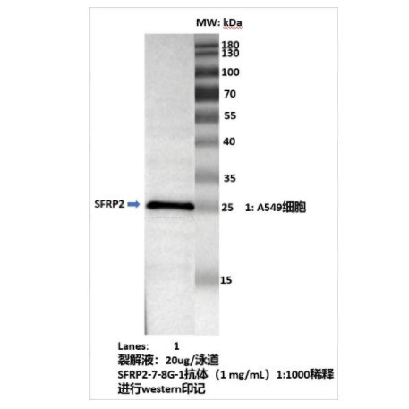 产品编号nrbe-12355A产品类型小鼠单克隆抗体英文名称Secreted Frizzled-related Protein 2中文名称分泌型卷曲相关蛋白2英文别名产品应用ELISA=1:500-5000,WB=1:1000-5000,IF=1:100-500Optimal working dilutions must be determined by the end user.Not yet tested in other applications.交叉反应Human,Mouse抗体来源Mouse免疫原Recombinant Human SFRP2 protein性状Liquid纯化方法affinity purified by Protein A浓度1mg/ml储存液0.01M PBS (pH7.4) with 1% BSA, 0.02% Proclin300 and 50% Glycerol.保存条件Shipped at 4℃. Store at -20℃ for one year. Avoid repeated freeze-thaw cycles.注意事项This product as supplied is intended for research use only, not for use in human, therapeutic or diagnostic applications.背景资料Secreted Frizzled-related Protein 2(SFRP2) 是分泌型卷曲相关蛋白家族成员,通过分泌至细胞外发挥功能。其结构含保守的 Frizzled 同源结构域(富含半胱氨酸),可竞争性结合 Wnt 配体,拮抗经典 Wnt/β-catenin 信号通路,抑制 β-catenin 入核及靶基因转录。SFRP2 参与胚胎发育、细胞增殖与凋亡调控,维持组织稳态。其启动子高甲基化常导致基因沉默,常见于结直肠癌、乳腺癌等癌症,促使 Wnt 通路异常激活,促进肿瘤生长、侵袭及耐药。此外,SFRP2 失调还与代谢疾病(如肥胖)、神经退行性疾病相关.。作为抑癌因子和 Wnt 通路关键调节分子,SFRP2 甲基化检测可用于癌症早期诊断,其功能恢复策略(如去甲基化药物)是潜在治疗方向。
