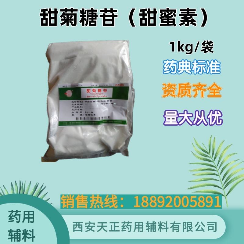 本品系以甜叶菊Stevia rebaudiana Bertoni 的叶子为原料,经水提取,树脂分离富集,乙醇或甲醇重结晶精制而得的糖苷类混合物。本品的主要成分为甜菊苷(C38H60O18),通常还伴有瑞鲍迪苷A、B、C、D、F,杜克苷A,甜茶苷和甜菊双糖苷等多种糖苷类成分。按干燥品计算,含甜菊糖苷以甜菊苷(C38H60O18)计,不得少于95.0%。