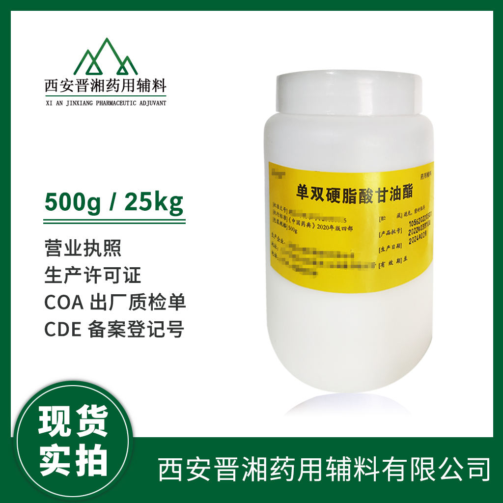 本品为单、二、三硬脂酸和棕榈酸混合甘油酯。由硬脂酸与过量甘油通过酯化反应制得,或由氢化植物油与甘油在催化剂的作用下,经过醇解反应制得。含单甘油酯应为40.0%~55.0%,二甘油酯应为30.0%~45.0%,三甘油酯应为5.0%~15.0%。【性状】本品为白色或类白色的蜡状颗粒或薄片。本品在60℃乙醇中极易溶,在水中几乎不溶。